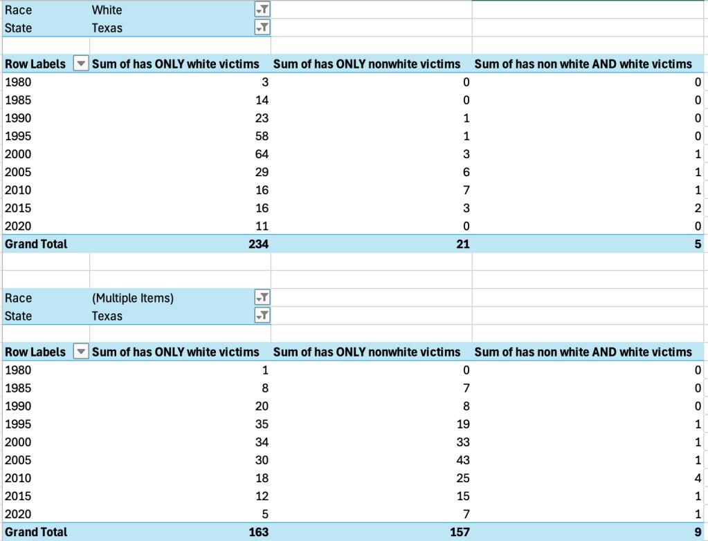 Before entering the data into Flourish, I made two Pivot tables; both filter out just Texas executions, but one filters only white perpetrators and one filters only non-white perpetrators: