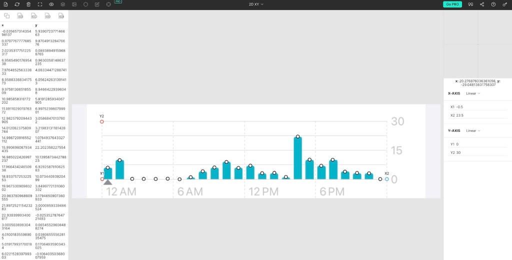 I needed to extract the number of minutes per hour in an accurate way, as Apple only provides the bars. I used the Plot Digitizer web tool to convert the bar graph for the number of minutes spent per hour into a .csv file.