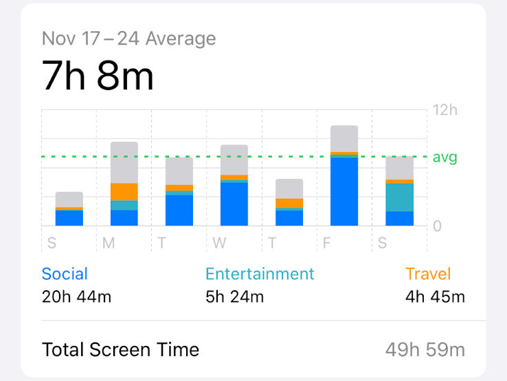 Apple making this data accessible made me curious to follow my own screentime over the past few months. Through this and conversations with other Gen Zers, it became quickly apparent that spending less than 7 hours/a day was hard. It took intentional effort. Seven hours is a long time, and yet we speak about these numbers so casually. Someone saying they have 4 hours/a day is met with, “Oh, that’s not bad at all!” I became interested in understanding how much of your day 7 hours really is.