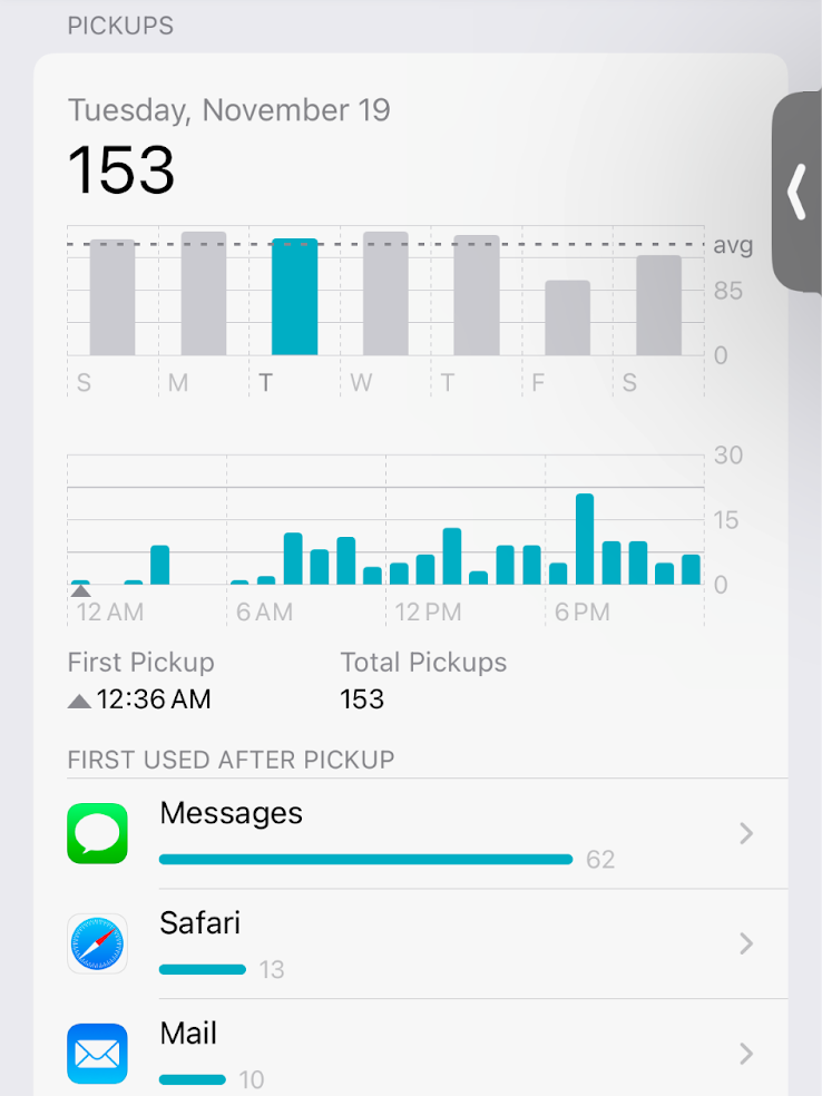 Through Settings → Screen Time → See All App & Website Activity, any iPhone user can access their screentime data. You can view the number of hours per day over the course of a week, and clicking a day of the week’s bar breaks the day further down by hour. You can also view the total number of pickups per day. This is mine: