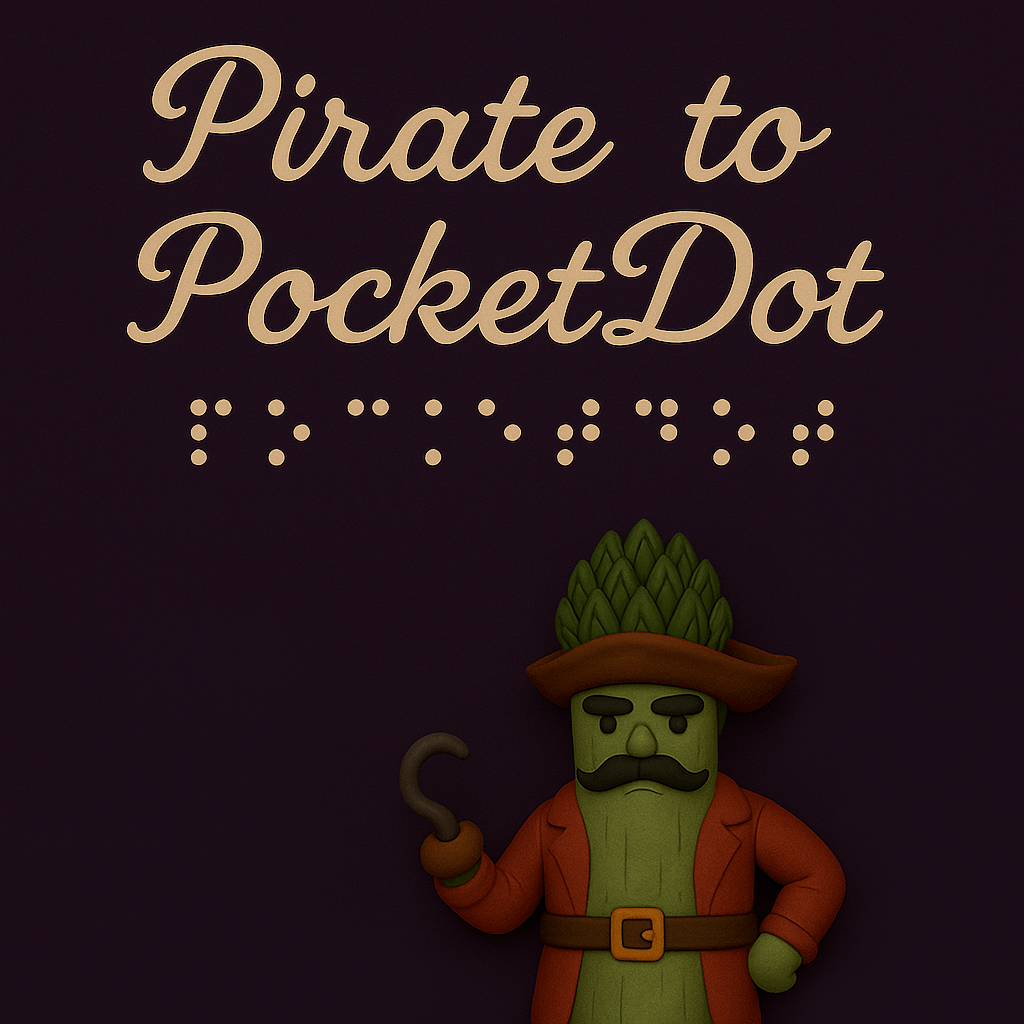 Alt text: The stylized cover art has a deep brownish-purple background. At the top, the title is written in large, elegant cursive font in tan color: “Pirate to PocketDot.” Directly beneath the title, the word “PocketDot” is spelled out in Braille using tan-colored dots. At the bottom center of the image stands a cartoonish asparagus character dressed as a pirate. The asparagus pirate has leafy green tips for hair, a dark mustache, a brown pirate hat, a red coat, and a belt with a gold buckle. His left hand is a classic pirate hook. The character has a stern, exaggerated expression, adding a humorous and quirky tone to the cover. The overall style is claymation.